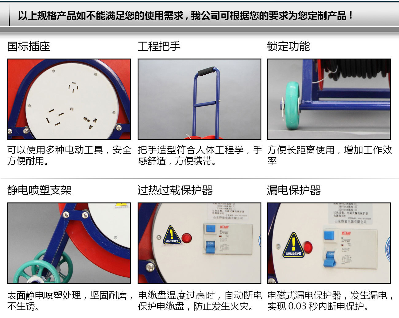 5.过热和过载保护器:电缆盘温度过高时,会自动切断电源以维护电缆盘,以防止火警。